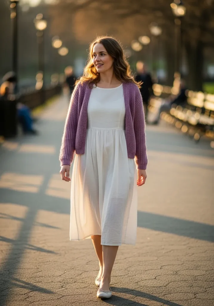 A soft white midi dress is layered with a lilac cardigan for a gentle pastel finish. The cardigan adds warmth and texture while keeping the outfit light. Simple flats or sandals complete the look in a very wearable way.