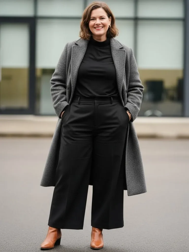 This outfit brings together the kind of quiet luxury that always feels right for winter workdays. A soft gray wool coat creates a classic outer layer that instantly sharpens the look. Underneath is a sleek black mock-neck top that adds a clean base without feeling too formal. The wide leg black trousers give the whole outfit a relaxed structure that moves beautifully and feels modern. The warm tan ankle boots add a little pop of color that keeps the look from feeling too monochrome while still staying office ready.