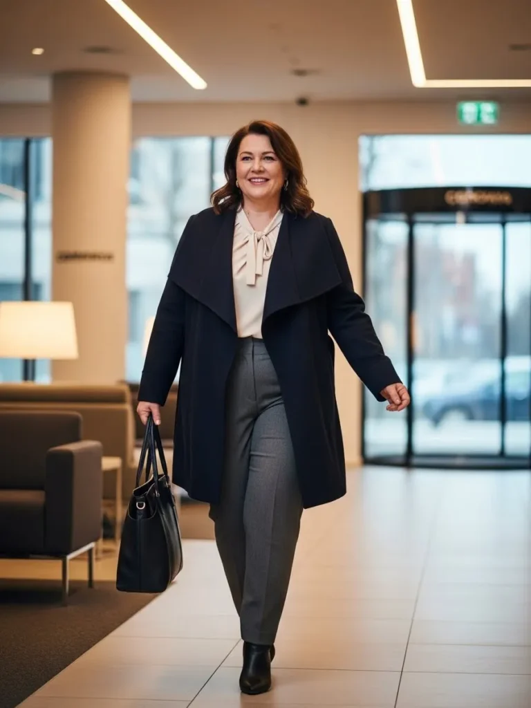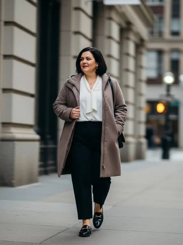 I love how this outfit quietly commands attention without shouting for it. The taupe coat softens the look in the most elegant way, and the white blouse brightens the face beautifully—such a lifesaver on those gray winter mornings. The black trousers are that dependable “makes-every-outfit-better” staple, and the loafers keep things chic but practical. To me, this is the kind of winter work outfit that feels incredibly put together while still being comfortable enough for commuting, meetings, and everything in between.