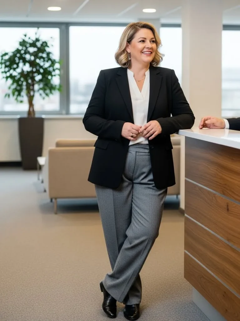 I love how this outfit strikes that sweet spot between power and comfort. The blazer creates a clean shape that always feels flattering on a curvy frame, and the grey trousers add a lovely balance that keeps things light in winter. The white blouse softens the entire look in the best way, making it feel bright and confident. This is the kind of outfit that makes me feel put together even on days when my coffee has to work overtime.