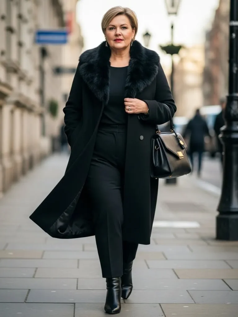 I love how this outfit proves that an all black palette can feel anything but basic. The clean lines create such a flattering shape and the faux fur collar brings in just the right amount of drama. It feels chic because it highlights confidence rather than clutter. I can see myself wearing something like this on a busy morning when I want to look like I planned everything perfectly even if I absolutely did not. It is warm, timeless, slimming and honestly just makes you feel unstoppable.