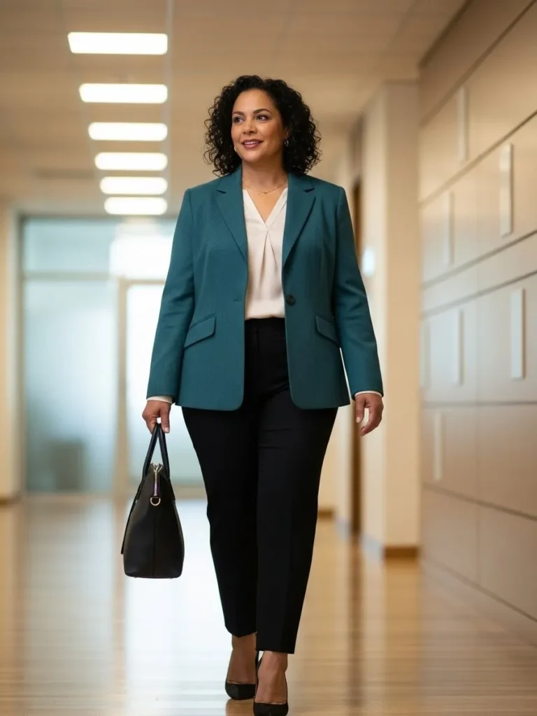 I love how this outfit hits that sweet spot between polished and comfortable. The teal blazer adds personality without being loud and the cream blouse softens everything so it never feels harsh. The silhouette is streamlined which always makes me feel more put together even on busy mornings. It is one of those looks that makes me walk a little taller and honestly that is half the magic of a great work outfit.