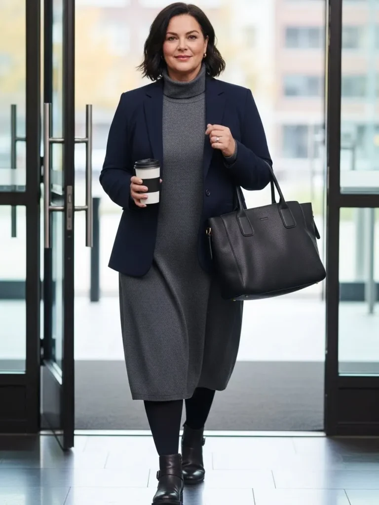 This look brings together a classic navy blazer with a soft charcoal turtleneck sweater dress that feels warm without looking bulky. The structured blazer adds polish while the dress drapes in that effortless way that makes winter dressing feel simple. Black tights and sleek ankle boots keep the whole outfit streamlined and practical for chilly mornings. The roomy black tote and a simple coffee cup in hand give the vibe of a woman who knows her routine and rocks it with confidence.