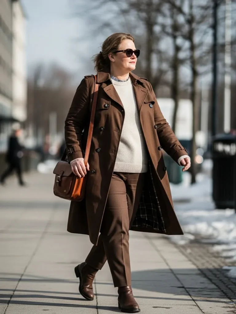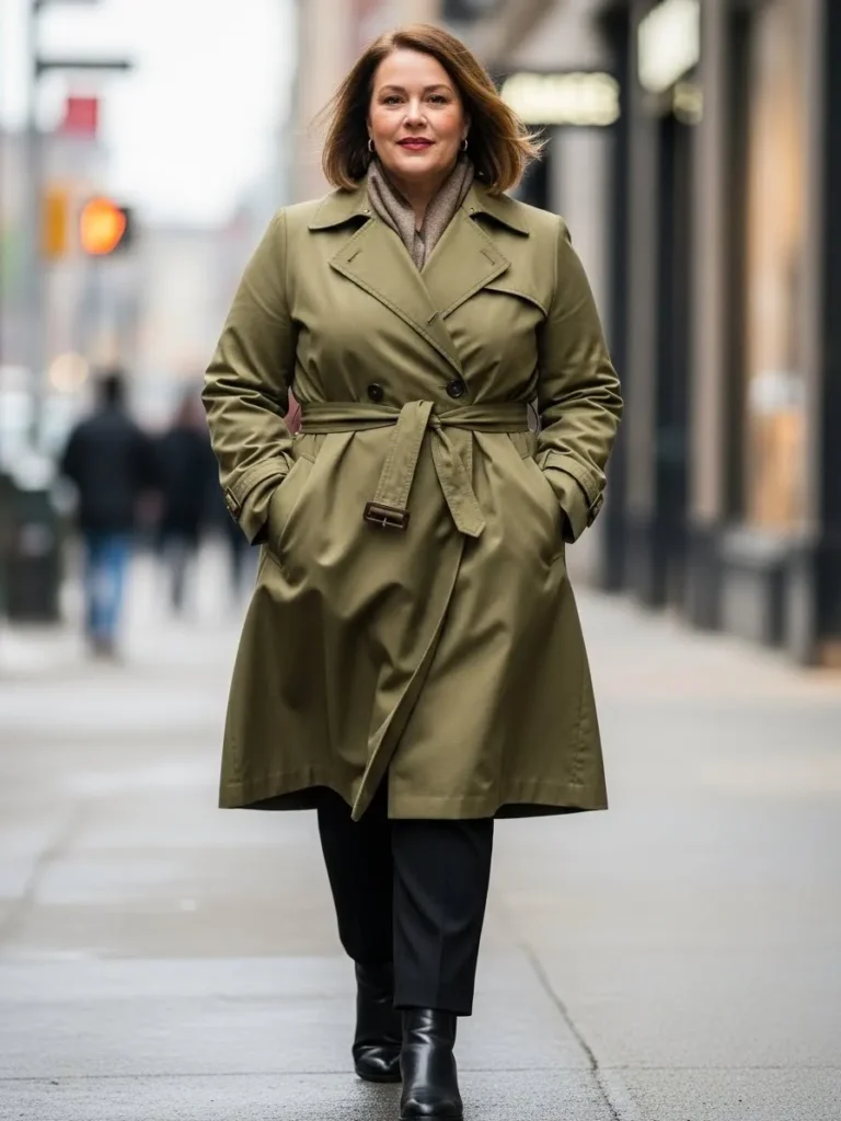 This look features a classic olive trench coat that instantly brings a polished winter energy to any workday. The coat has that structured yet soft fabric that moves beautifully while still keeping everything warm and pulled together. Underneath she wears sleek black trousers paired with black ankle boots that ground the whole outfit and give it a clean straight line from waist to floor. The soft neutral scarf adds a cozy touch near the face and ties the tones together in such an effortless way. The overall vibe feels confident practical and quietly elegant which is exactly what makes it stand out on a busy winter street.