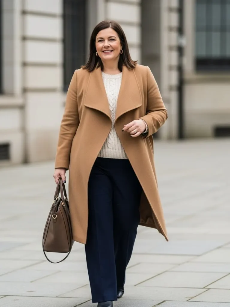 I love how this outfit feels powerful without trying too hard. A black wrap coat always makes me feel instantly put together and the waist tie gives a lovely silhouette that works beautifully on a fuller figure. The mix of gray trousers and black boots keeps the lines long which is one of my favorite tricks for feeling taller and more confident. And that chunky scarf is the perfect blend of warm and stylish. It is the kind of outfit I reach for when I want to stay cozy but still look like I absolutely know what I am doing.