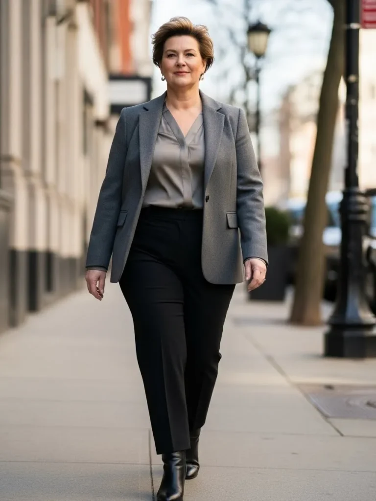 This outfit brings together a beautifully structured gray blazer with a soft draped blouse in a muted taupe shade that feels elegant without trying too hard. The blazer has that perfect tailored fit that instantly sharpens the silhouette, while the blouse adds a gentle flow that keeps the look relaxed yet polished. Paired with classic black straight leg trousers and sleek black ankle boots, the whole ensemble feels purposeful and refined. The vibe is very city chic walking to an important meeting while still looking calm, collected, and completely in control.