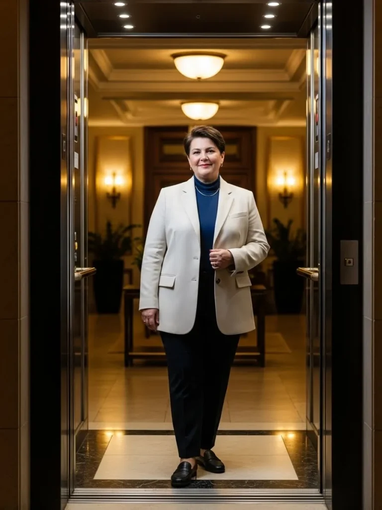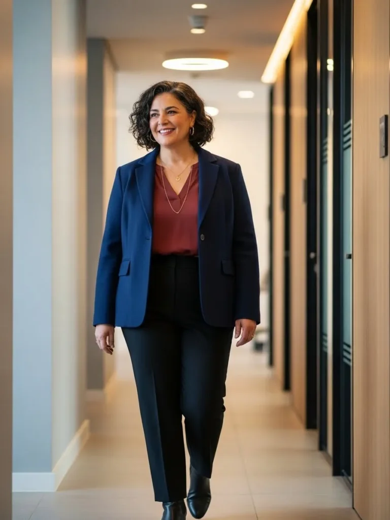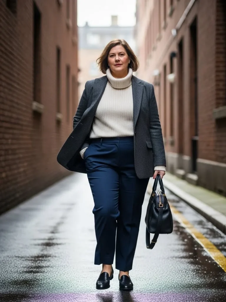 I love how this look balances comfort and authority at the same time. The turtleneck feels warm and relaxed while the blazer sharpens everything just enough to make it boardroom worthy. The navy trousers add a clean line that makes me feel pulled together without trying too hard. It is one of those outfits that makes me feel like I can handle anything on my schedule while still staying warm on a chilly workday.