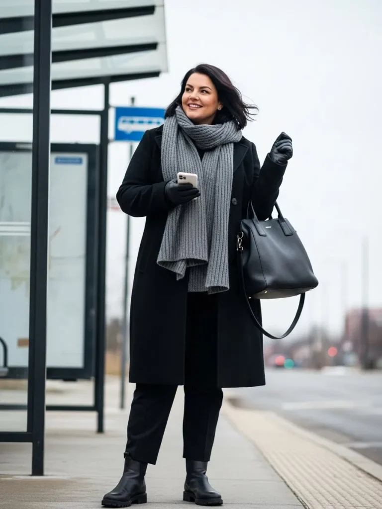 This outfit blends classic winter polish with that effortless commuter chic vibe we all secretly aim for on cold Monday mornings. The long black wool coat creates a smooth, tailored line that instantly feels put together, while the chunky ribbed gray scarf adds warmth and softness without overpowering the look. Black ankle pants keep the silhouette sharp, and the sturdy black boots ground everything with a practical yet stylish finish. The leather tote and gloves tie the whole outfit together with a clean, minimal touch that feels both professional and winter ready.