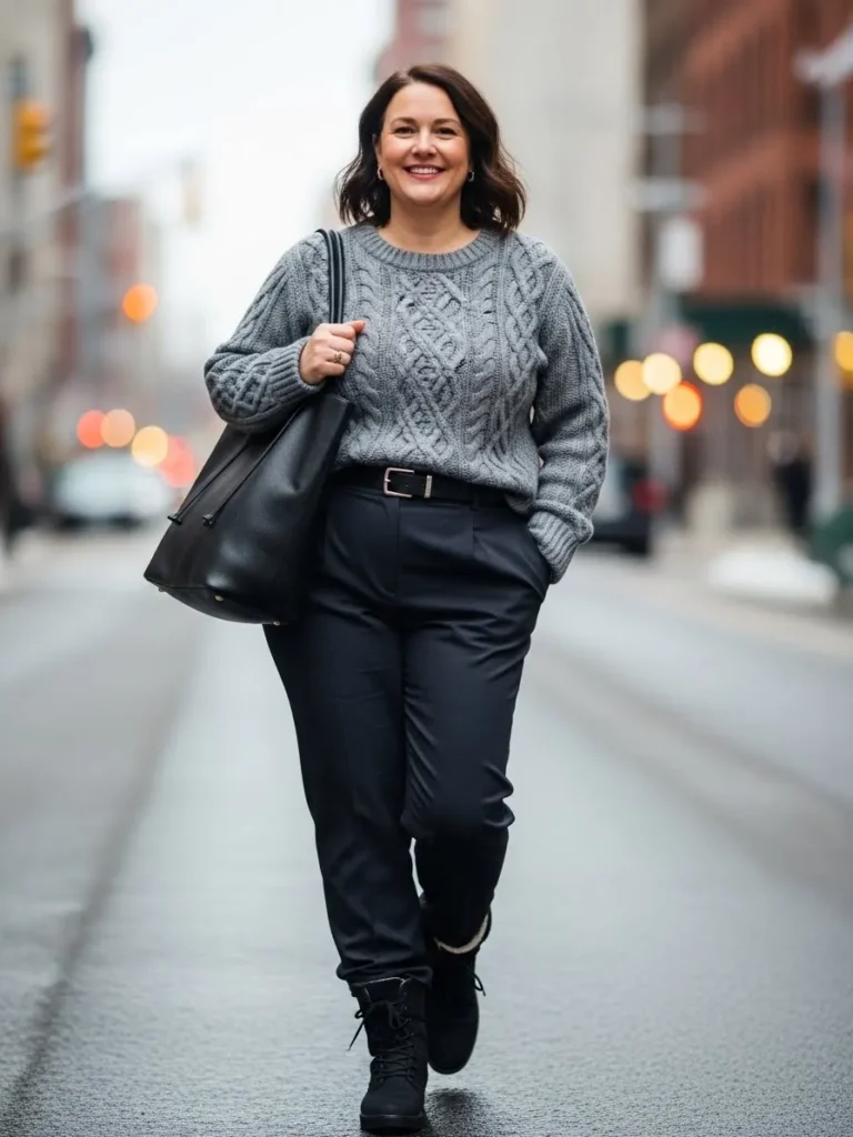 Cozy Gray Cable Knit With Tailored Winter Trousers