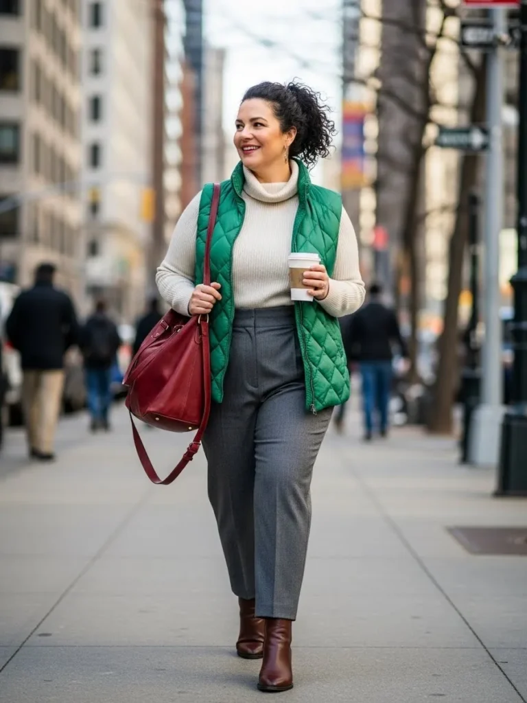 This outfit brings together a bright quilted green vest layered over a soft cream turtleneck sweater that looks warm without feeling bulky. The tailored gray trousers add a polished office ready vibe and the rich brown ankle boots tie everything together with a little seasonal charm. The deep red structured tote adds a confident pop of color and gives the whole look that practical yet pulled together feel we all want on a busy winter morning.