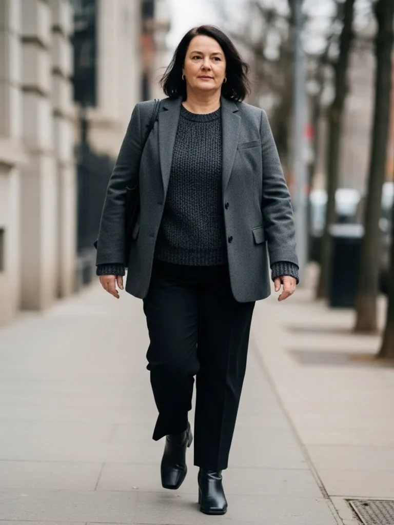 This look blends a classic gray blazer with a textured charcoal knit sweater that feels warm without looking bulky. Paired with sleek black tailored trousers and simple black ankle boots, the outfit has that confident city stride energy. The palette stays in moody winter neutrals which makes everything feel streamlined and professional. Each piece has clean lines and a soft structured vibe that works beautifully for colder workdays when you still want to look sharp.