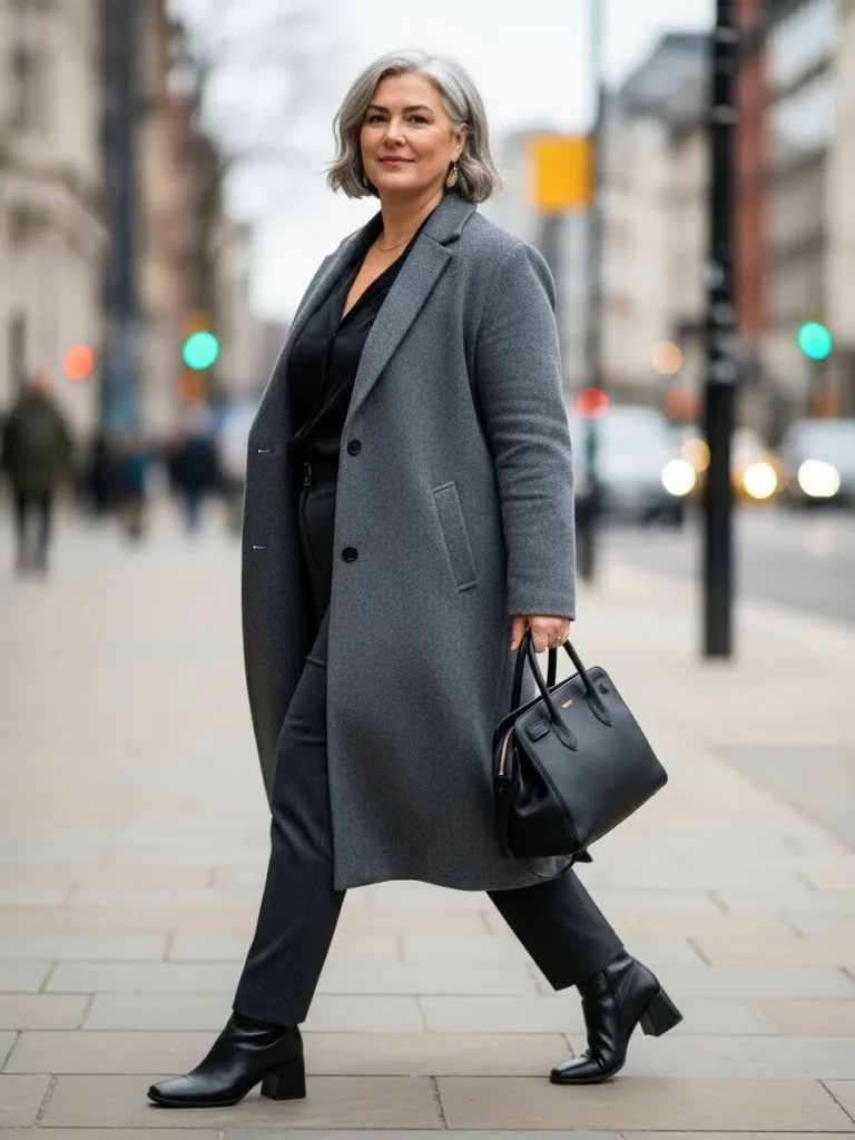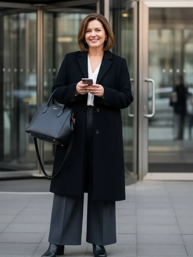 This look pairs a long charcoal coat with a soft wool texture over an all black base that feels polished without trying too hard. The black blouse brings a gentle drape while the tailored trousers keep everything structured and office ready. The outfit finishes with block heel ankle boots in smooth leather and a structured black tote that adds instant authority. The overall vibe is confident city chic with that wonderful winter sharpness that always looks expensive.
