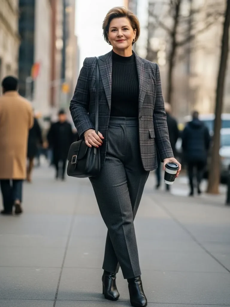 This outfit blends classic tailoring with a modern city feel. The plaid blazer adds a structured touch with its soft grey and charcoal pattern while the black ribbed knit top keeps everything sleek and warm. The high waisted grey trousers create a clean line that feels tailored without looking stiff. Black ankle boots and a simple black shoulder bag finish the look with subtle polish. The whole vibe feels effortless and put together in that chic I know what I’m doing kind of way.