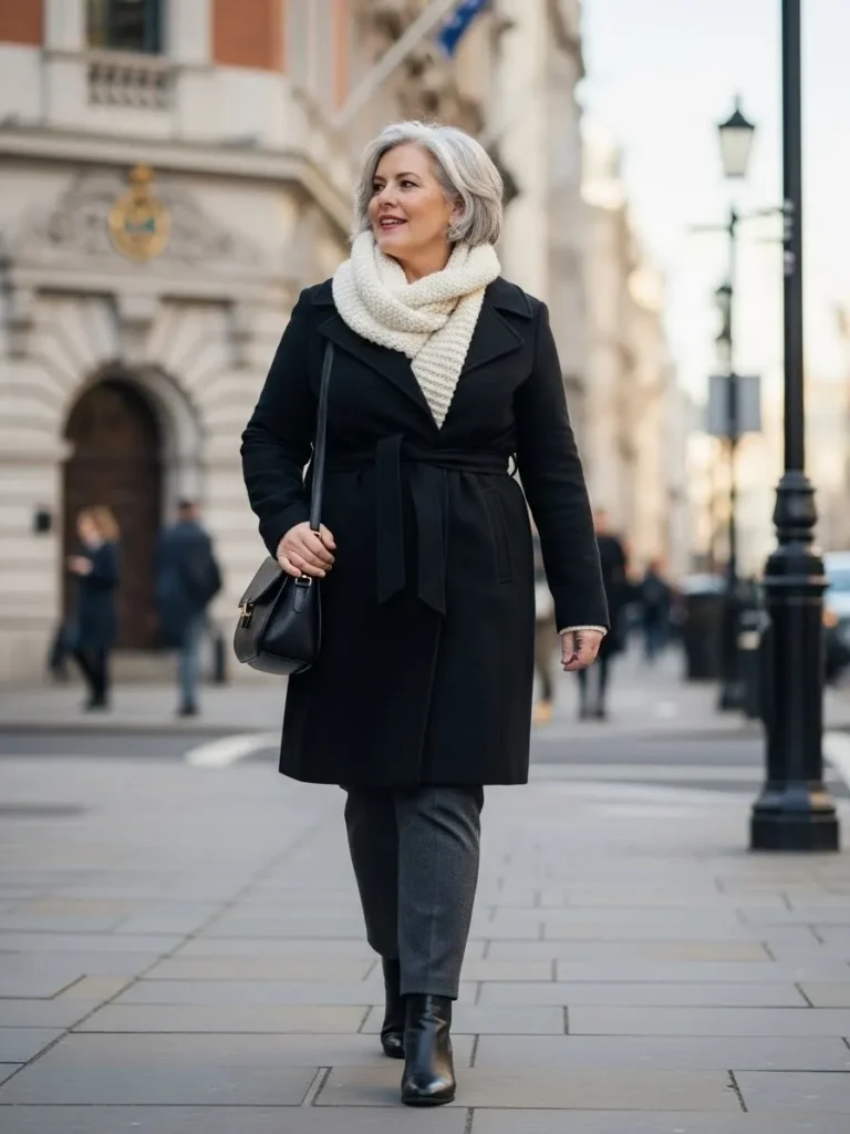 This look blends polished professionalism with soft winter warmth in the prettiest way. The outfit features a sleek black wrap coat that ties at the waist for a clean and flattering shape. Underneath, tailored gray trousers add a structured contrast and keep the outfit feeling office ready without feeling stiff. The creamy knit scarf brings in that delicious touch of texture we all crave when the air gets chilly. Black ankle boots and a simple crossbody bag keep everything streamlined and city chic while the soft gray hair and natural makeup make the whole look feel effortless and elegant.