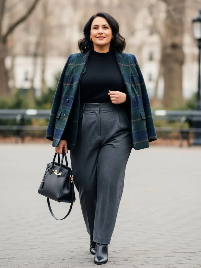 This outfit mixes polished tailoring with a little winter charm. The dark plaid blazer instantly adds personality with its soft green and navy palette while the black knit top keeps everything sleek and simple underneath. The high waisted charcoal trousers create a smooth line through the leg and pair beautifully with the structured black handbag and classic ankle boots. The whole look feels warm yet professional with textures that read rich without being fussy.