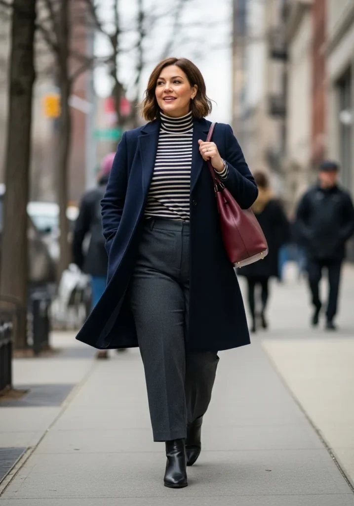I love this combination because it mixes structure and softness in all the right ways. The tailored trousers balance the playful stripe, and the navy coat frames the whole outfit so beautifully. I also find that a turtleneck works wonders in winter, keeping me warm without adding bulk. The burgundy bag adds personality without clashing, and honestly the whole look just feels effortlessly refined. Perfect for days when I want to look like I have my life together even if I’m running for the train.
