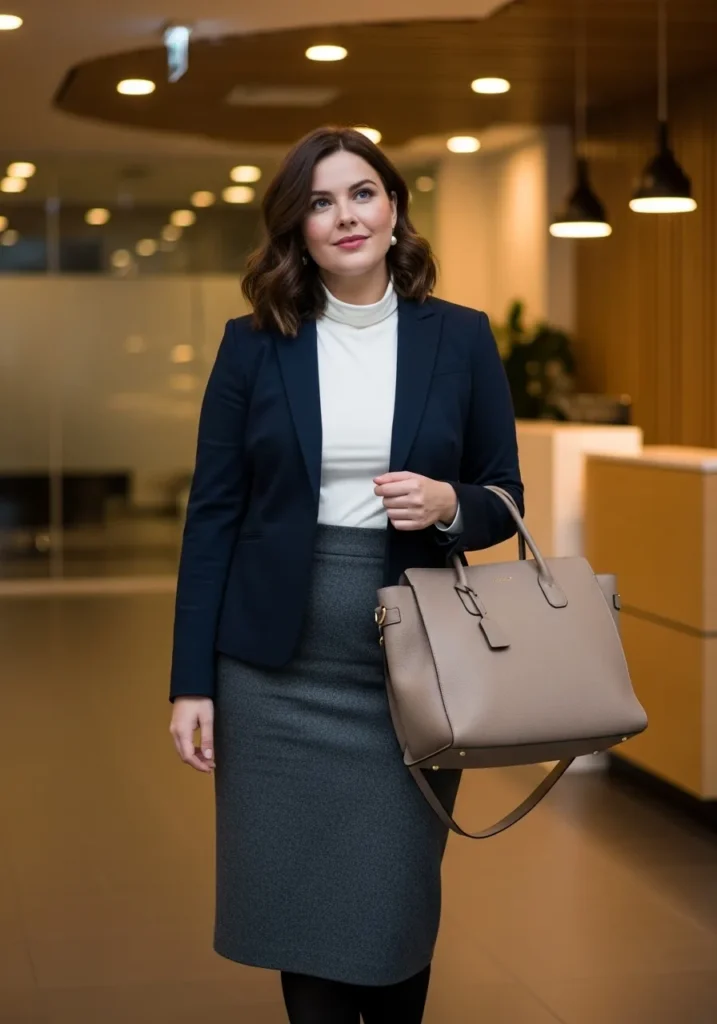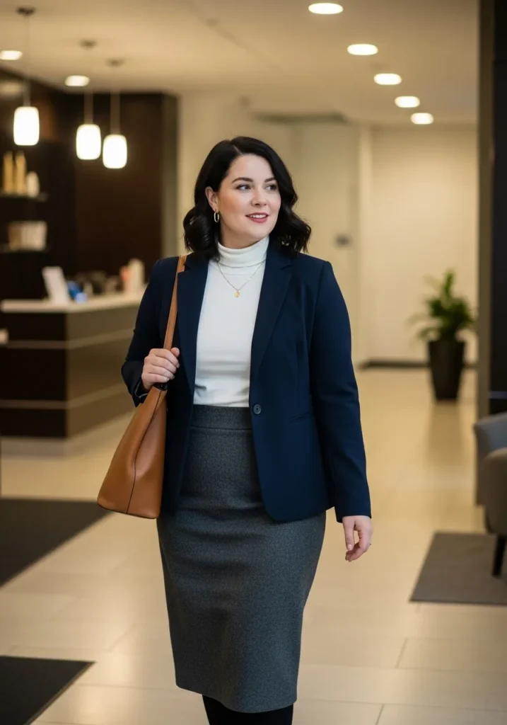 I love this look because it feels effortlessly put together and works for so many work settings. A navy blazer is one of my winter go to pieces because it makes me feel sharp without trying too hard. The pencil skirt adds that classic office silhouette while the turtleneck keeps things cozy when the office AC feels like the Arctic. This whole outfit says Professional Plus Size Winter Outfits for Work That Look Polished and Warm while still being comfortable enough to actually get through a long day.