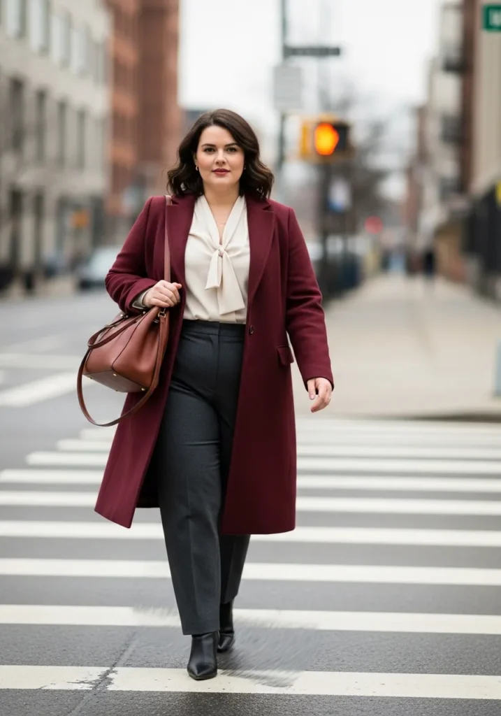 I love this outfit because it hits that perfect balance of cozy and sophisticated. The long burgundy coat creates a sleek line that feels flattering on curves. The cream blouse softens the look just enough without losing the polished feel. And honestly, tailored trousers in winter always give me that confident walk across the crosswalk energy. It is warm, chic, and the kind of look that makes you feel like the main character on your morning commute.