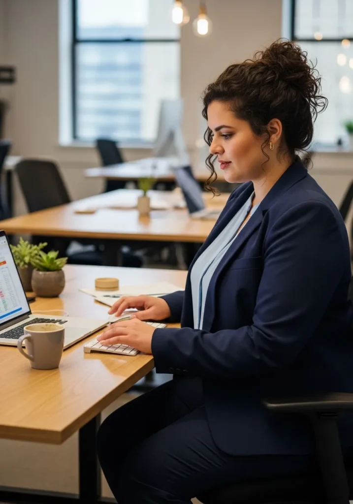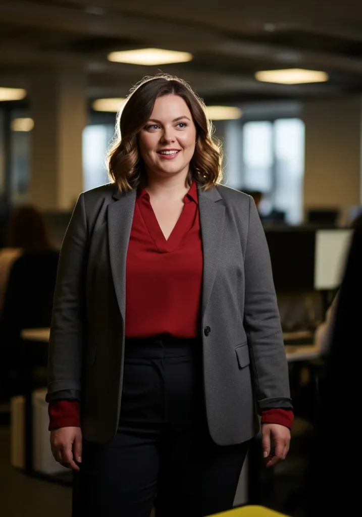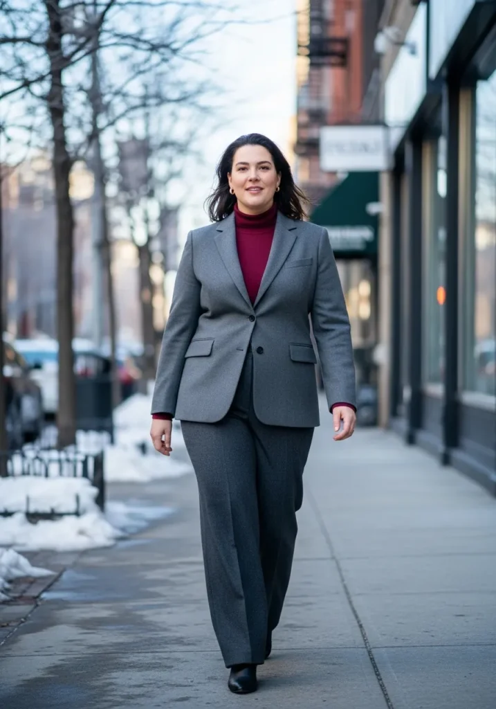 I love this outfit because it hits that sweet spot between classic and warm. The blazer keeps everything looking sharp while the red blouse adds personality without going over the top. I also find that the mix of tailored shapes and soft fabrics is incredibly flattering on a curvy frame. It frames the waist, brightens the face, and feels like something I could actually wear all day without fussing with it. It is one of those Professional Plus Size Winter Outfits for Work That Look Polished and Warm that just makes you walk a little taller.