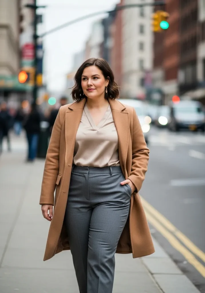 I love this outfit because it feels put together without trying too hard. The long camel coat gives me that confident movie main character energy, and the neutral blouse feels elegant while still being totally comfortable. The gray trousers anchor everything so the look stays chic and flattering. It is one of those winter outfits that makes you feel warm, polished, and genuinely stylish all at the same time.