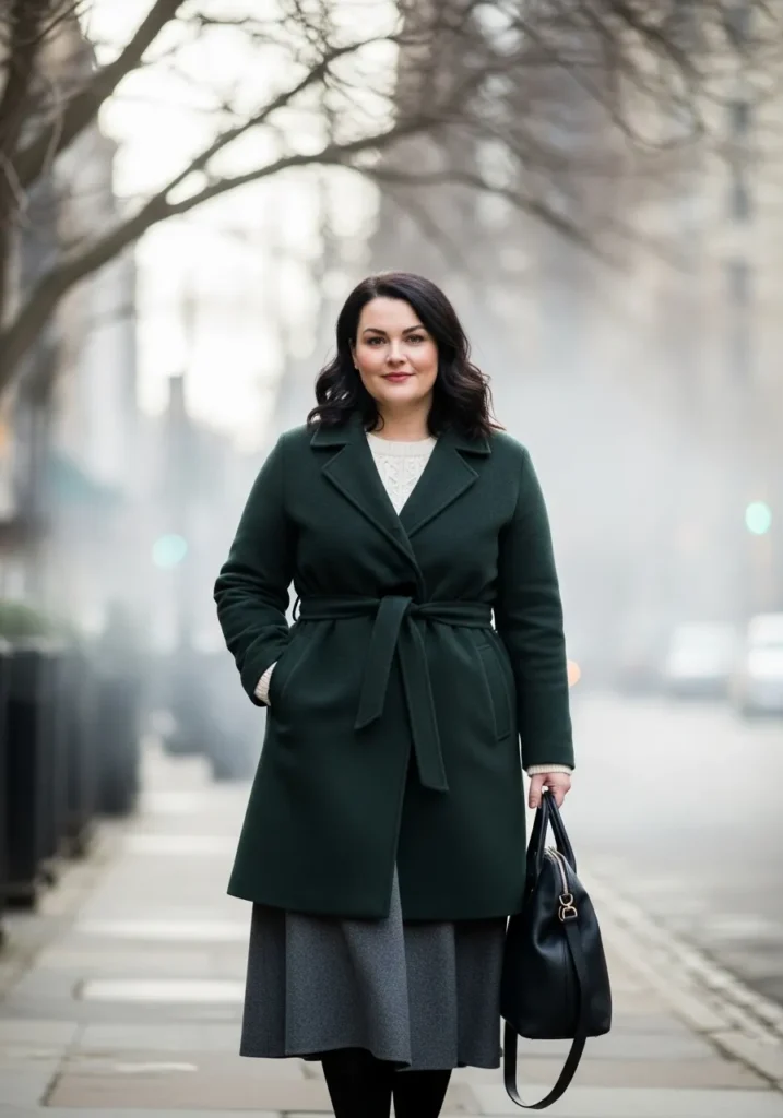 Deep Green Belted Coat with a Soft Winter Knit