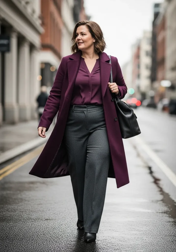 I love this look because the color harmony does so much of the styling work without feeling loud. The long coat creates a clean vertical line that feels super flattering on a plus size figure and the tailored trousers balance everything out. I also adore how the plum shade brings warmth to a grey winter day without screaming for attention. It is the kind of outfit that makes you feel put together the moment you step outside.