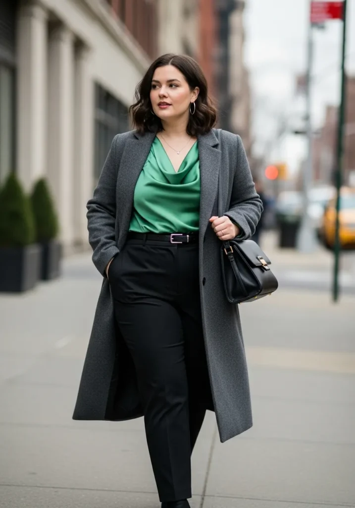This outfit is such a classy winter work look with just the right amount of color. The rich charcoal coat brings that tailored, polished feel, and underneath it sits a gorgeous satin-like green blouse with a flattering draped neckline that instantly brightens the whole look. She pairs it with sleek black tailored trousers and a structured black handbag that ties everything together. The fabrics feel smooth, warm and elevated, and the overall vibe is very confident city-professional on a chilly morning.