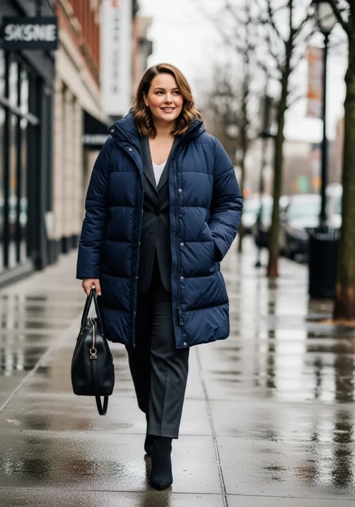 I love how this outfit balances comfort and professionalism. I reach for looks like this when I want to stay warm on icy mornings but still feel like I’m wearing a real work outfit. The puffer adds softness while the suit keeps the shape clean. The dark colors are flattering and easy to style. It feels confident and polished and warm enough to survive the sidewalk wind tunnel moments. This is the kind of look that makes winter mornings feel a lot less stressful.