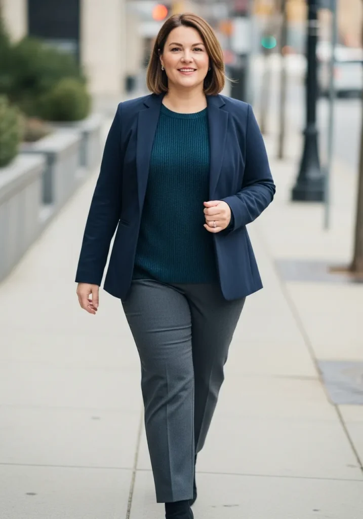 I love this outfit because it checks every box for Professional Plus Size Winter Outfits for Work That Look Polished and Warm. The navy suit creates a clean long line that always feels flattering on me, and the soft blue top adds just enough contrast without stealing the show. It is the kind of look that makes me feel capable the moment I sit down at my desk. There is something about a good blazer that just boosts your whole mood. I would wear this on any day when I want to feel confident without overthinking my outfit.