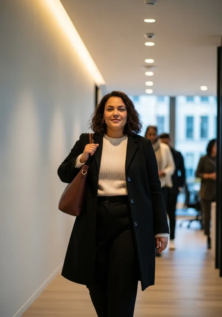 I love this look because it hits that sweet spot where comfort meets polish. The cream sweater softens the structured coat and the monochrome black pieces make everything feel sleek without feeling heavy. I always feel my best in outfits like this because they look effortless yet still very Professional Plus Size Winter Outfits for Work That Look Polished and Warm. It is the kind of combo that gets you through a full workday while still making you feel like the most composed woman walking down the hallway.