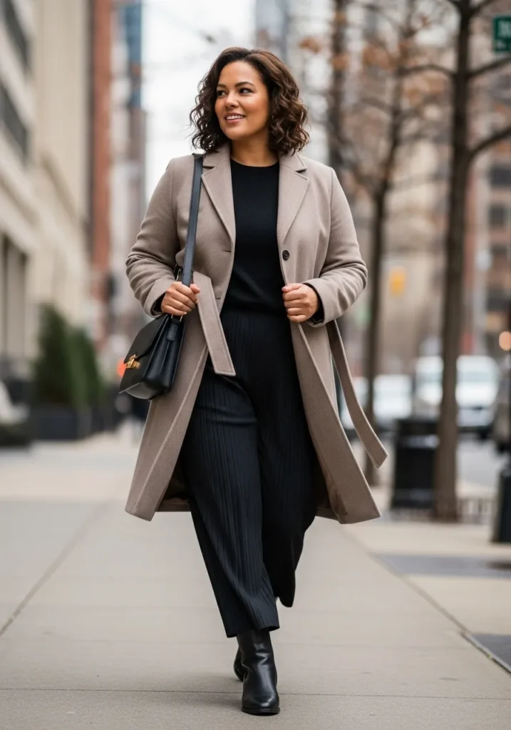 I love how this look feels effortlessly put together without trying too hard. The taupe coat brightens the outfit just enough while the all black base keeps everything long and streamlined. I always feel like a tailored coat instantly makes me look more polished even on days when I’m rushing out the door. This is one of those Professional Plus Size Winter Outfits for Work That Look Polished and Warm that feels reliable and chic at the same time which is honestly my favorite kind of winter outfit magic.
