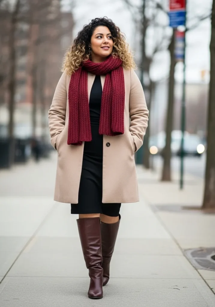 I love how effortlessly this outfit works for busy workdays. The neutral coat feels timeless and the black dress creates a smooth base that always looks flattering. That rich burgundy scarf is such a smart way to add personality without trying too hard. I also appreciate how the tall boots give the outfit a little extra presence while still being comfortable enough for commuting. It is the kind of winter look I reach for when I want to look polished and warm without overthinking anything.
