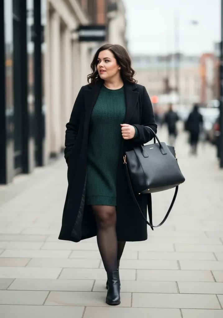 This look pairs a deep green knit sweater dress with a long black coat that brings instant polish. The dress has that soft, cozy texture that feels perfect for winter workdays while still keeping a clean silhouette. The coat adds structure and length that balances the outfit beautifully. Black ankle boots and a structured black tote finish everything with a confident, pulled together vibe that feels both modern and timeless.