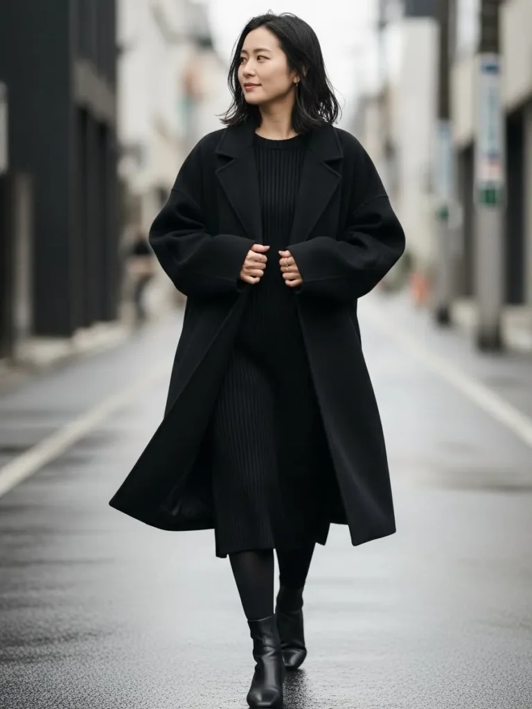This look features an oversized black coat layered over a ribbed black knit dress or long knit top. The relaxed fit of the coat adds movement while keeping the look warm and streamlined. Black tights and ankle boots complete the outfit.