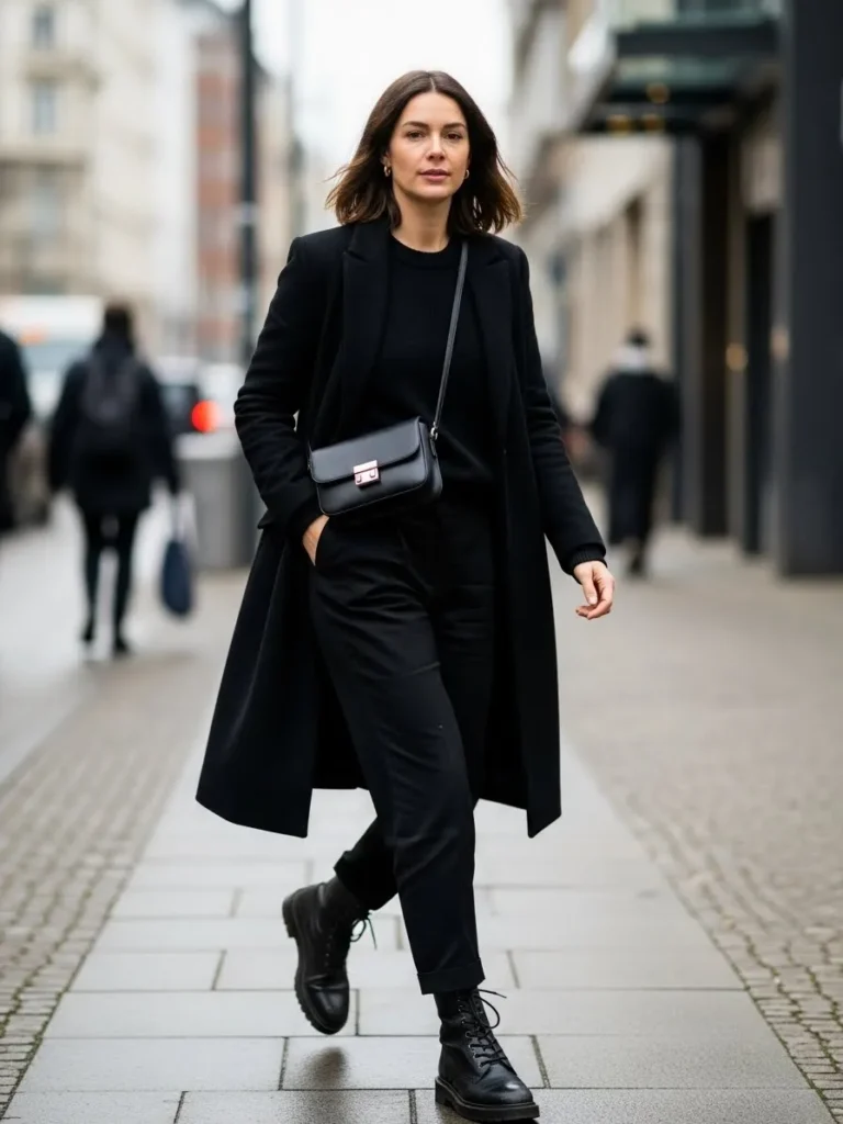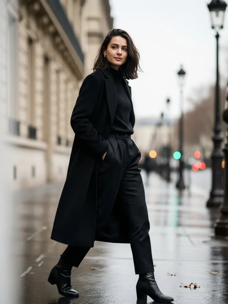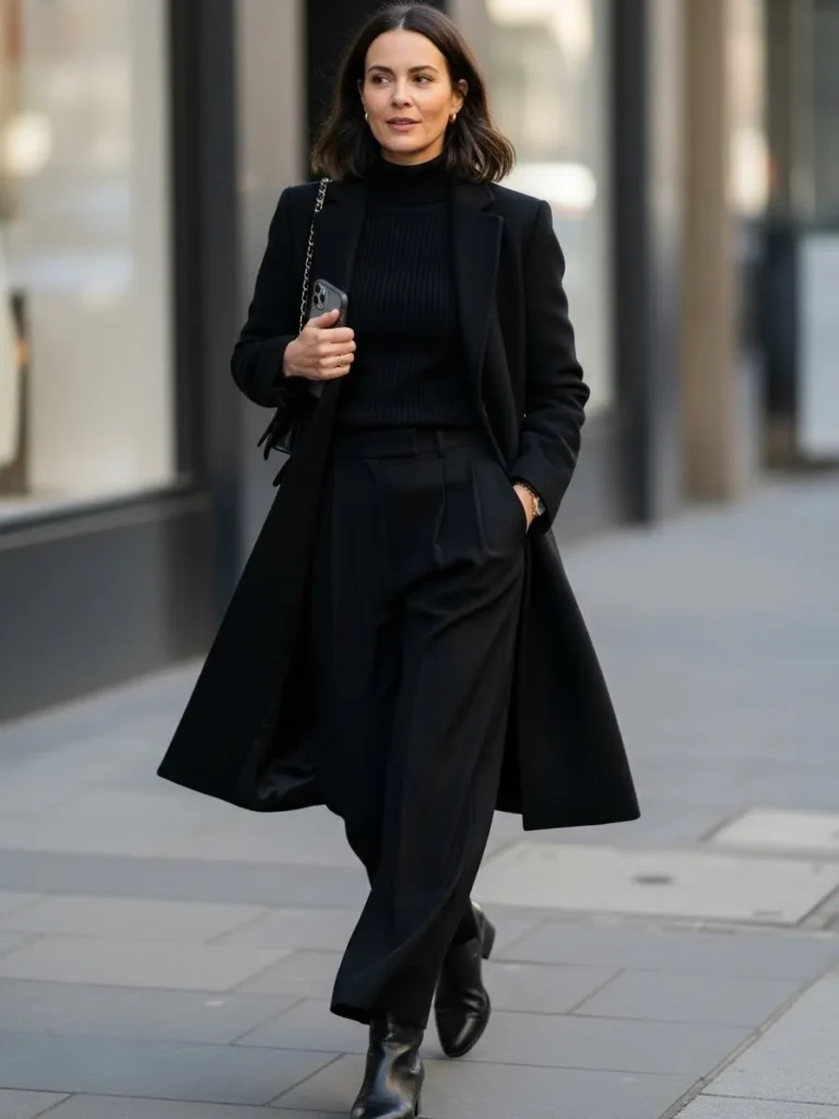 This look pairs a long black coat with a simple black top and relaxed tailored trousers. The clean lines and slightly loose fit give it a modern, effortless feel. Black ankle boots keep everything grounded while still looking polished.