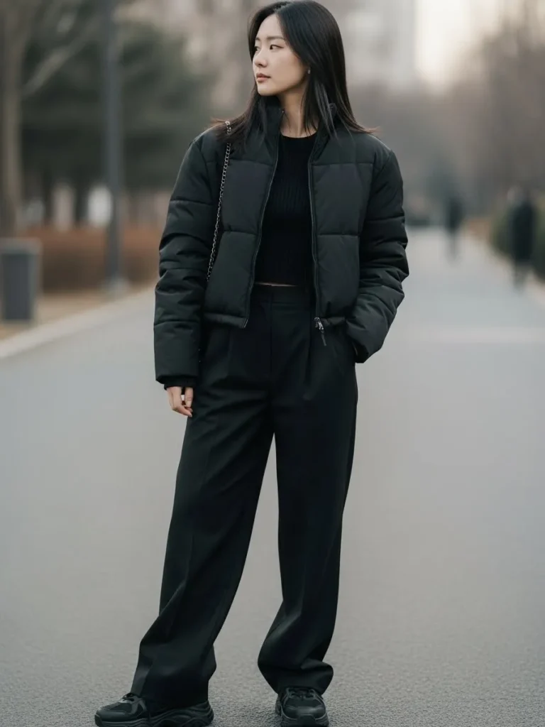 This outfit features a cropped black puffer jacket layered over a fitted black top and wide leg black trousers. The shorter jacket adds a modern silhouette while keeping things warm. Simple black sneakers or boots keep the look grounded and casual.