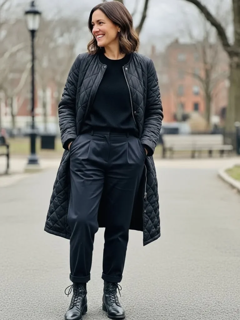 This look features a quilted black coat layered over a black sweater and relaxed black trousers. The quilted texture adds interest while keeping the outfit lightweight and warm. Black lace up boots give it a slightly casual edge.