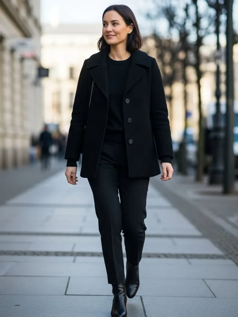 This outfit features a structured black coat layered over a simple black top and slim black trousers. The clean tailoring keeps everything sharp, while black ankle boots add a polished finish. The fabrics look smooth and refined, giving the whole outfit a timeless and understated feel.