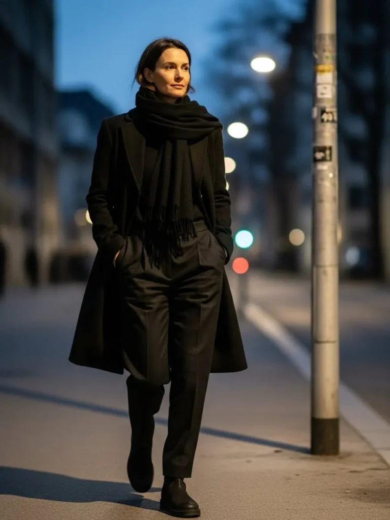This look pairs a long black coat with a soft black sweater, tailored black trousers, and a chunky black scarf wrapped around the neck. The layers feel warm and intentional, while black ankle boots keep the look grounded and practical.