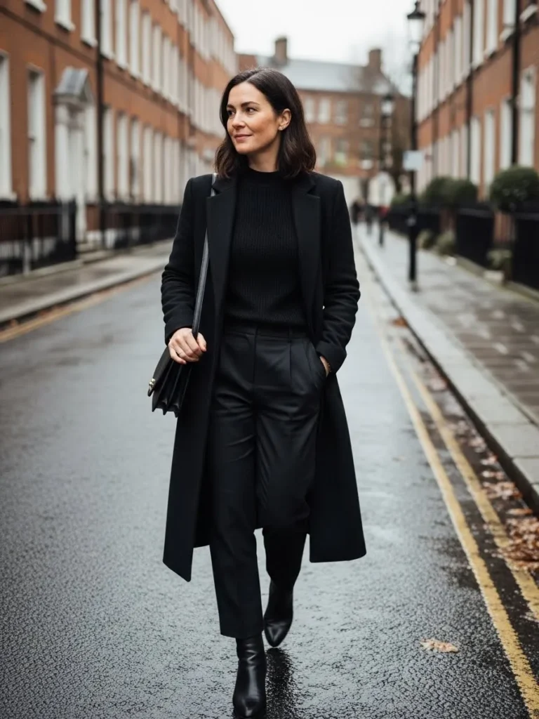 This look features a black coat layered over a ribbed black top and tailored black trousers. The clean lines and subtle textures keep the outfit interesting without breaking the all black theme. Black ankle boots and a small shoulder bag complete the look.