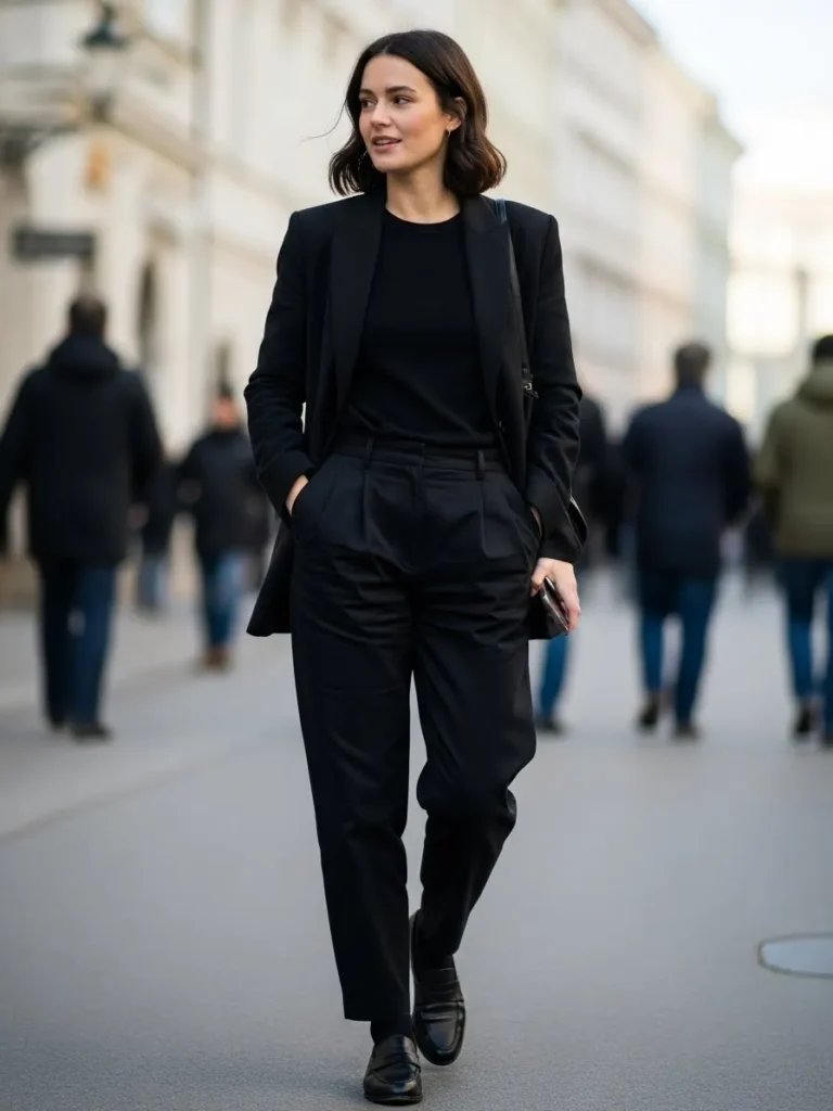 This look features a tailored black blazer layered over a simple black top, paired with structured black trousers that fall cleanly through the leg. The fabrics look smooth and refined, giving the outfit a sharp yet wearable feel. Finished with black loafers and a small shoulder bag, the overall vibe feels modern, minimal, and very city chic.