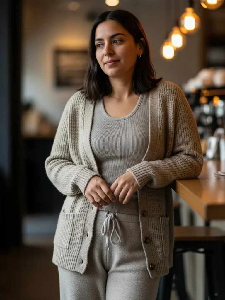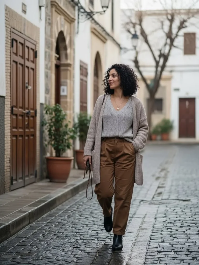 The cardigan adds warmth without feeling bulky, and the tones stay soft and flattering.