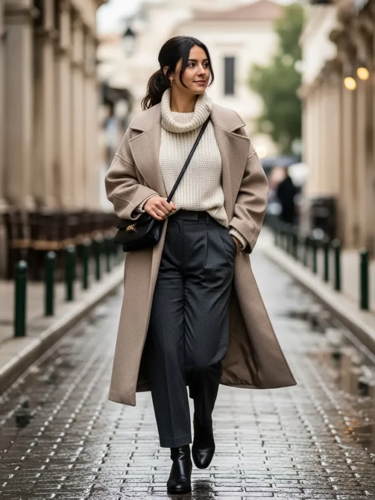 This look features a long beige coat worn open over a soft knit sweater and dark trousers. The layers fall naturally and create a clean silhouette that feels warm without being bulky. The neutral palette keeps everything cohesive and easy to style. The overall feel is polished yet very approachable.