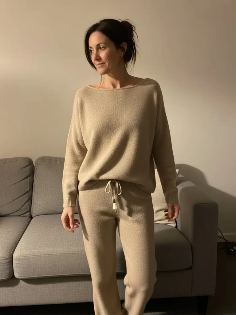 Worn indoors with minimal styling, the whole look feels calm, warm, and quietly put together.