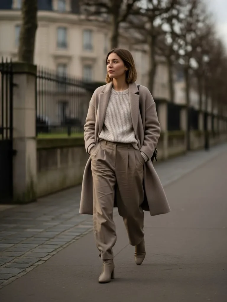 This outfit features a beige coat layered over a simple knit sweater and relaxed trousers. The pieces fall naturally and create a laid back silhouette that still feels intentional. The tones stay soft and easy on the eyes. The vibe feels casual cozy and everyday friendly.