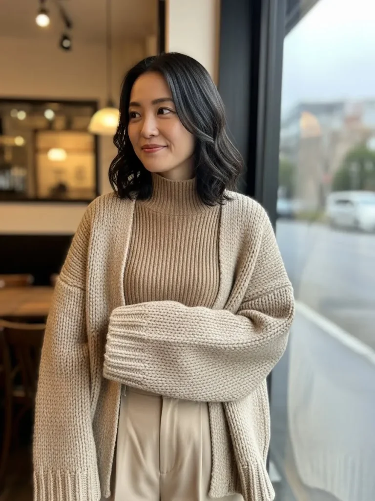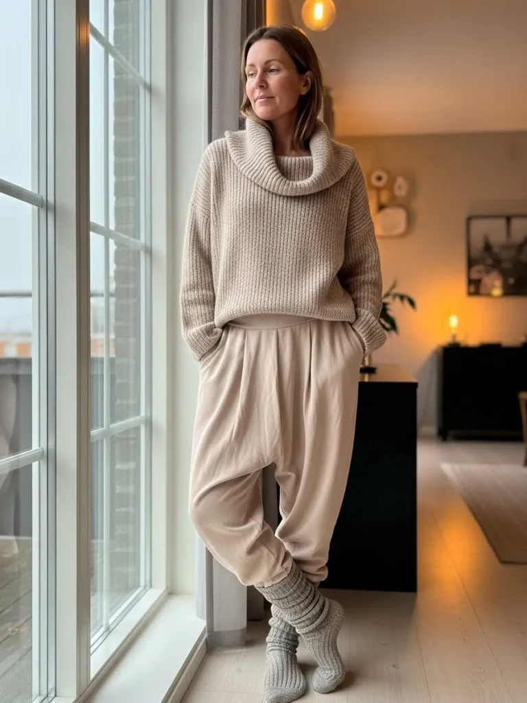 This outfit leans into comfort with a soft oversized knit sweater paired with loose beige pants. The fabrics look plush and warm with natural drape that adds to the cozy feel. Everything feels relaxed and gentle. The overall look feels calm and homey.