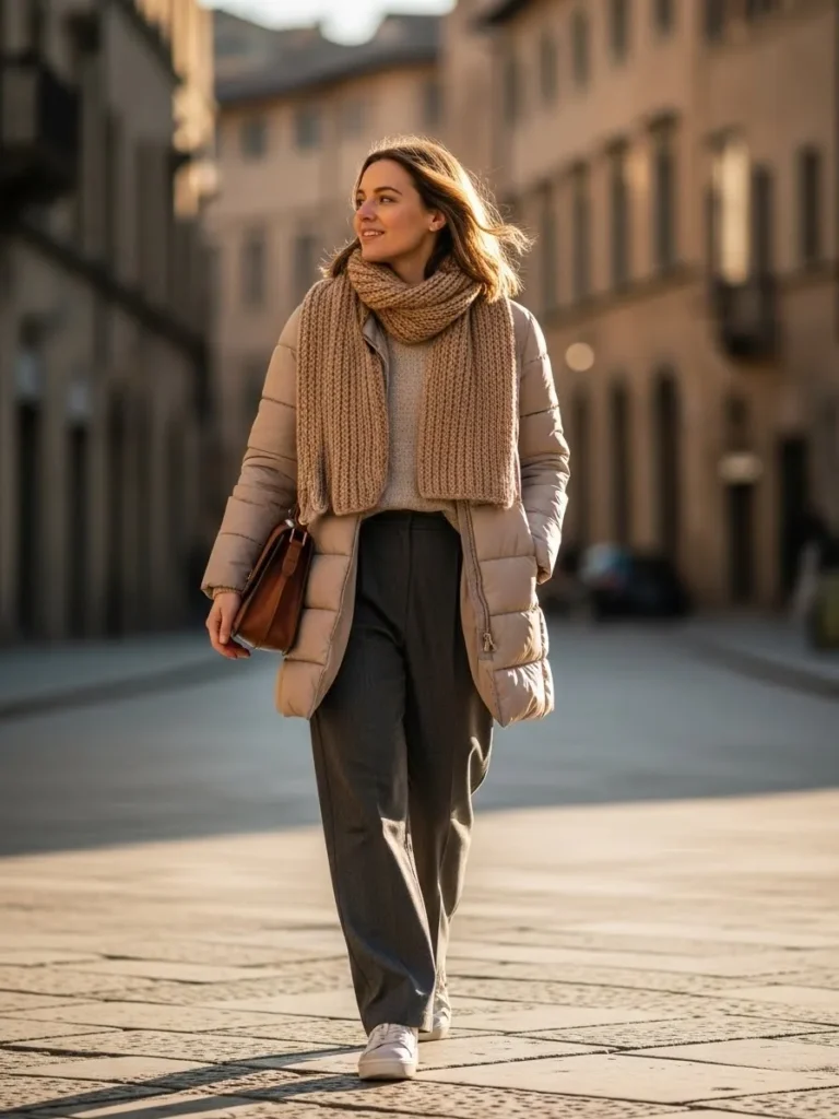 This outfit combines a beige puffer jacket with wide leg neutral trousers and a cozy scarf in soft earthy tones.