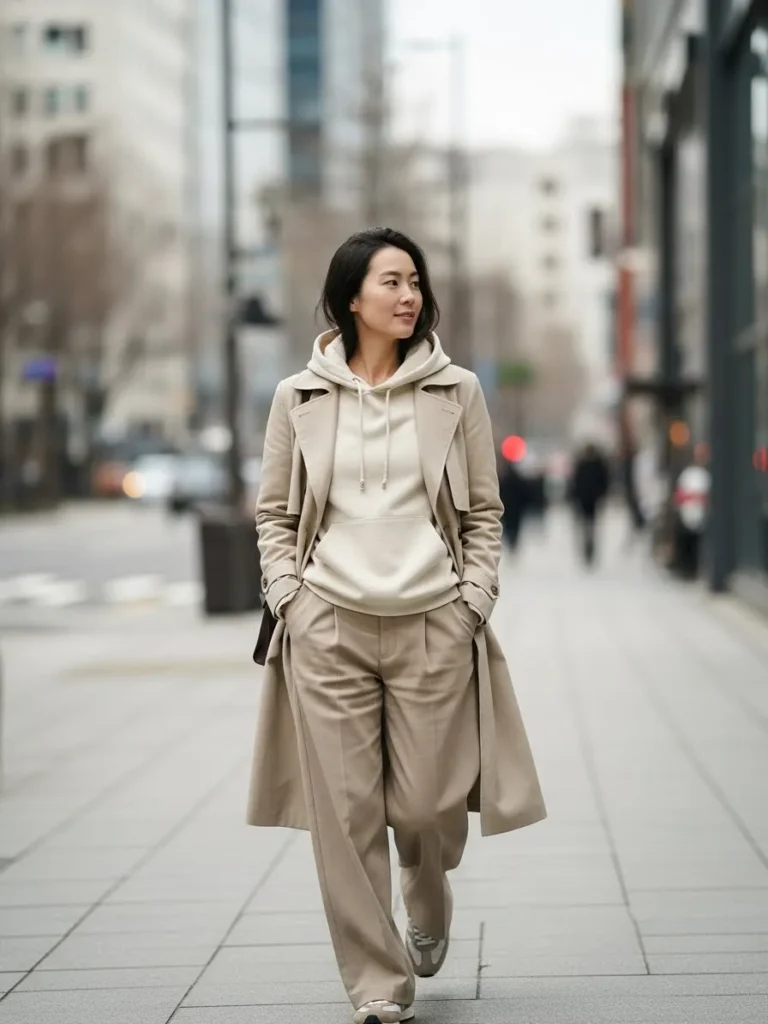The hoodie adds warmth without feeling bulky, and the beige tones keep everything looking intentional.