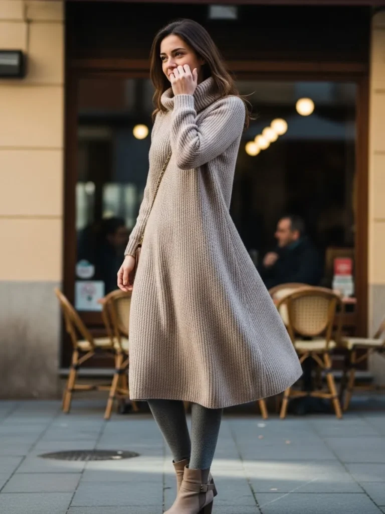 Paired with neutral leggings and ankle boots, the outfit feels cozy yet refined.