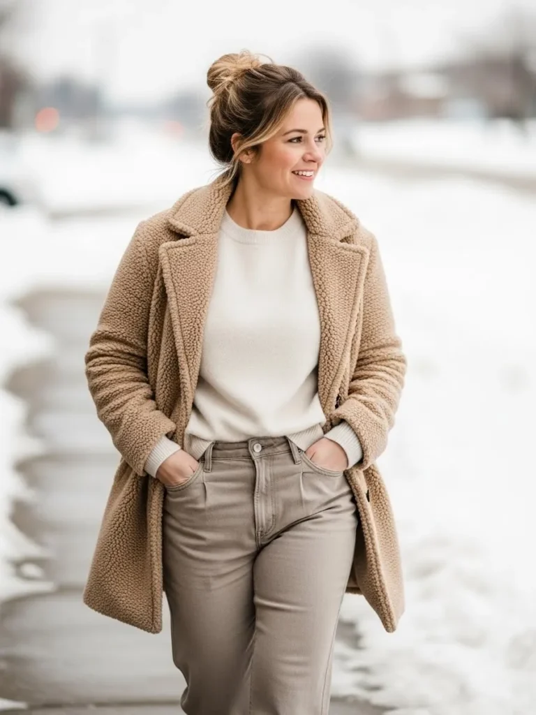 This outfit combines a plush beige teddy coat with a classic cream sweater underneath.